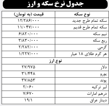 جدول نرخ سکه و ارز